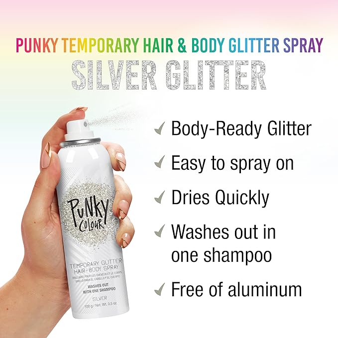 - Punky- Spray On Hair & Body Glitter Spray: This multipurpose metallic, glittery spray is lightweight and made with the finest glitter to add sparkle and extra glam to your style. Can be used on hair, skin, or clothing, too! For a glittering silver from head to toe!