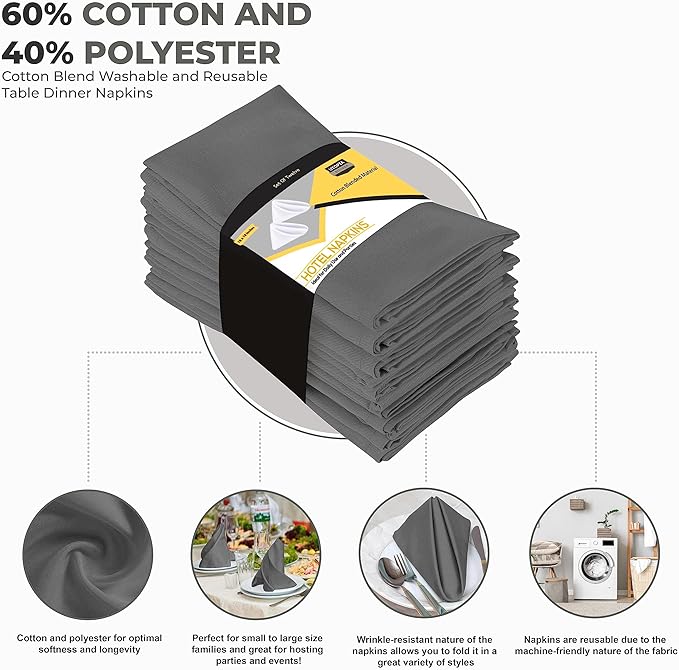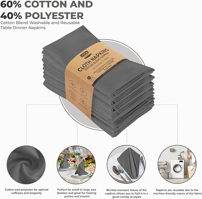 Utopia Kitchen Steel Grey Cloth Napkins [12 Pack, 18x18 Inch] Absorbent Cotton Blend Washable and Reusable for Dinner, Restaurant, Lunch, Wedding and Hotel