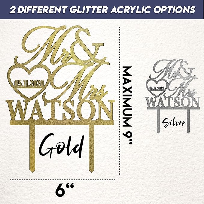 Wedding Cake Topper Personalized, Custom Mr. Mrs. Cake Topper w Last Name, Silver Glitter Acrylic Decoration for Special Event