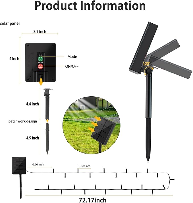 - ๐ Easy Install Solar Powered String Lights: Solar panel with ground stake, 72ft long Christmas solar lights outdoor is perfect for wrapping around a tree or wherever you like to light up your garden, patio, lawn, porch, gate, yard, etc. The wire between the first LED light and the solar panel (lead cable) is around 6.5 ft, so you can put the panel in a suitable place.