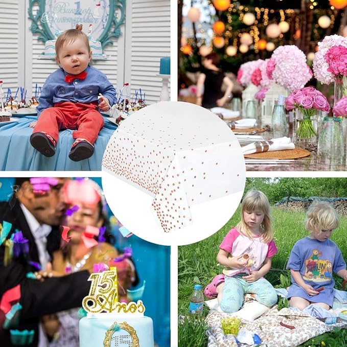 12 Pack Plastic Tablecloths for Rectangle Tables, Waterproof Disposable Party Table Cloths with Rose Gold Dot, Table Covers for Decorations, Baby Shower, Birthday, Wedding, 54” x 108”