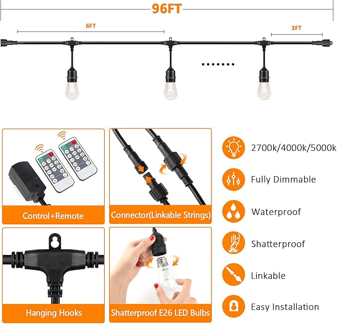 Lakumu 2-Pack 3 Color Dimmable LED Outdoor String Lights for Patio with Remotes, 96FT Waterproof Hanging Lights with Shatterproof Edison Bulbs for Bistro Backyard-Warm White/Neutral White/Daylight