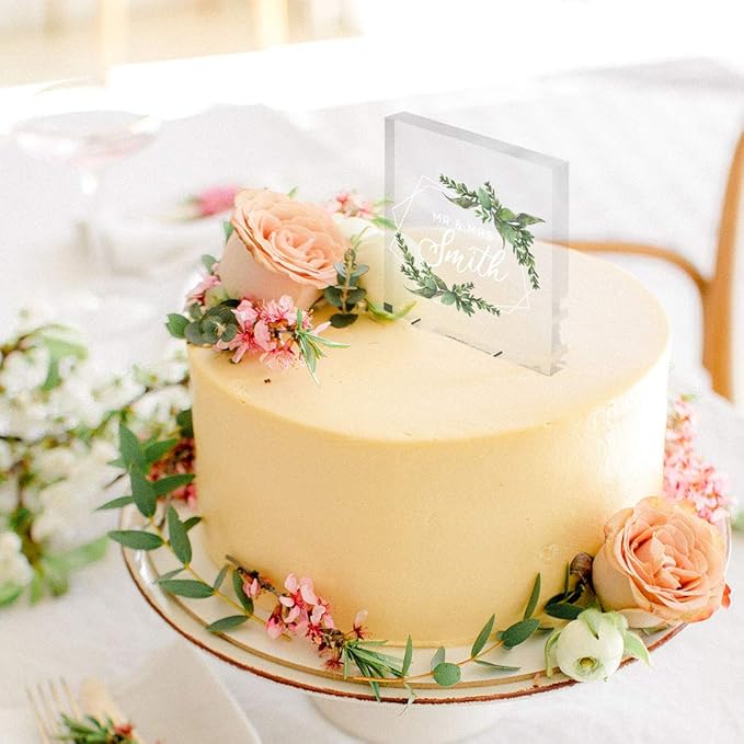 - MATERIAL High quality acrylic square cake topper suitable for all wedding themes, colors, or cake decorations. Includes 2 thick acrylic stakes built in the cake topper design. Premium quality acrylic.
