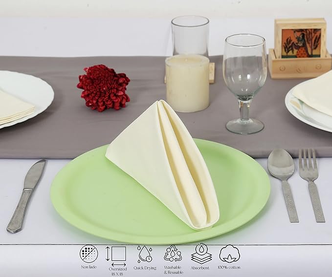 - COTTON DINNER NAPKINS - 100% Natural Cotton fabric, High Quality Cotton Cloth Table Napkins that last for years, it will never fray or leave annoying lint. Add a touch of class to your dinner table by placing these elegant dinner napkins, the set is available in a pack of 12