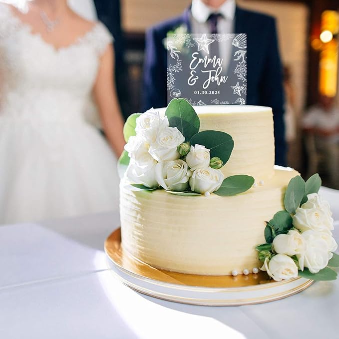 Andaz Press Beach Nautical Ocean Custom Wedding Cake Topper, Acrylic Square Personalized Couple Cake Topper