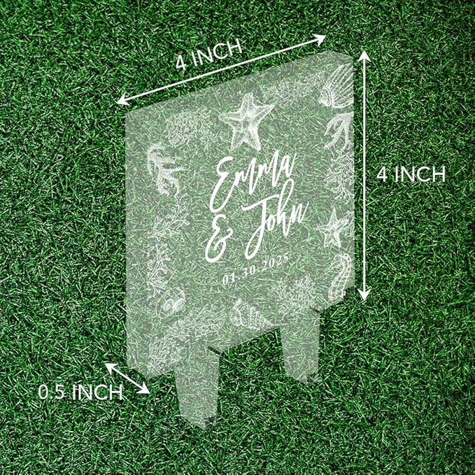 - SIZE Popular 4" x 4" Inches Clear Acrylic Square Size, 1" Thickness - Ideal for most size wedding cakes. Custom personalized designs available - choose from styles with name, date, monogram initial, or all three.