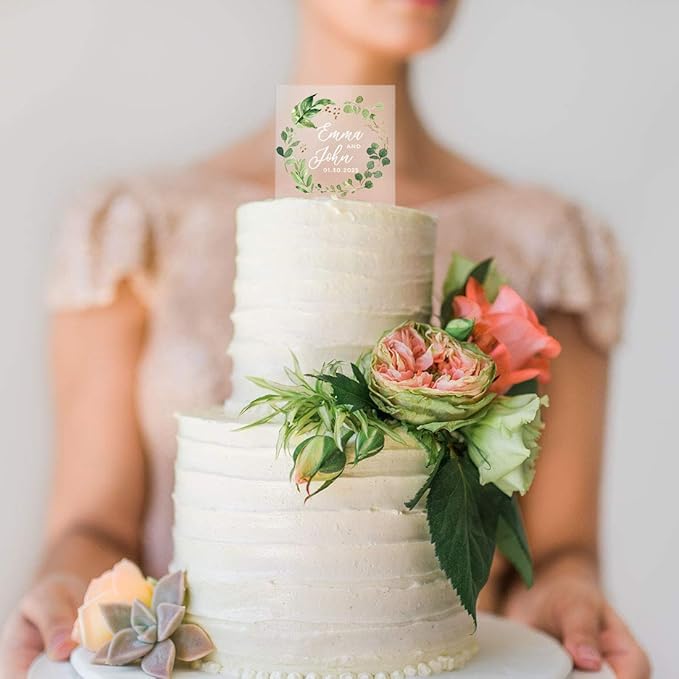 Andaz Press Eucalyptus Wreath Custom Wedding Cake Topper, Acrylic Square Personalized Couple Cake Topper