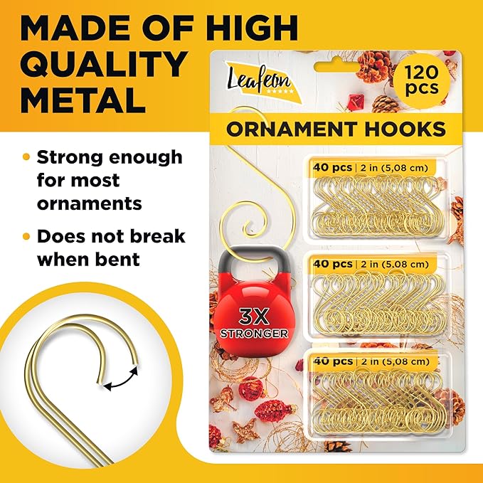 - 🎄 INCLUDES: 120 S-Shaped Gold Metal Ornament Hooks 2”. These are perfect assistants in Christmas decorating due to their optimal size and strength.