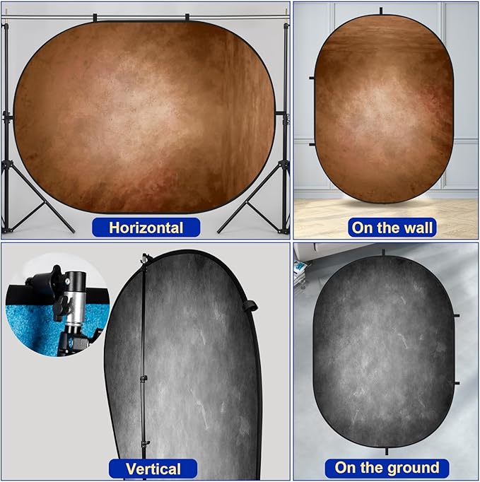 - 3 nylon buckles are individually set around each collapsible backdrop. Hanging in portrait or landscape depends on yourself.