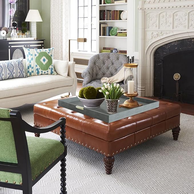 - Oversized faux leather serving tray for serving your favorite foods and beverages atop your ottoman or coffee table; Boasts an ample serving area with high sides and cutout handles; Ribbed base is an attractive accent that inhibits items from sliding around.