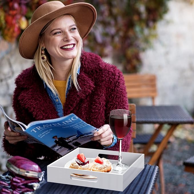 Home Decorative Coffee Table Tray, 10"x10" Elegant Acrylic Serving Trays with Handles Works for Eating, Breakfast, Makeup Drawer Organizer,Bathroom Vanity Table,Ottoman Tray, White