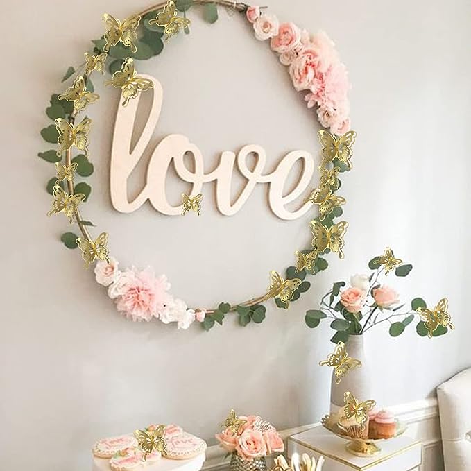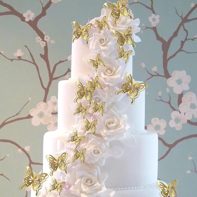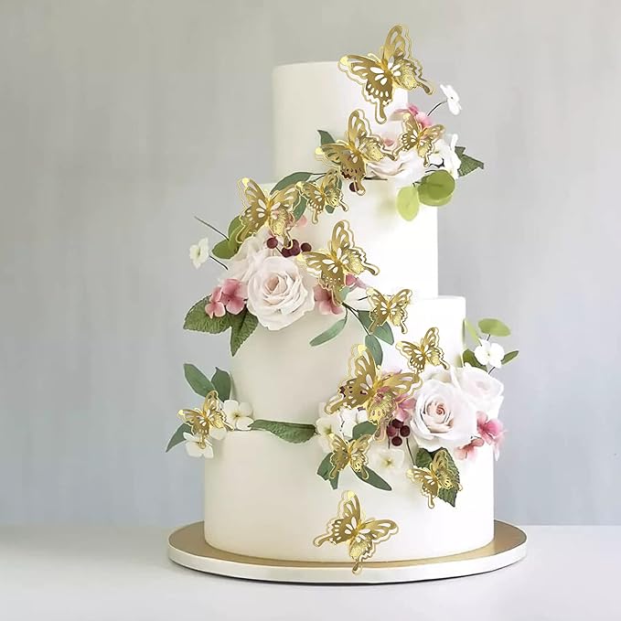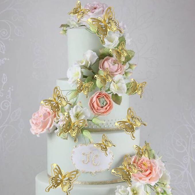 40 PCS Gold Lively 3D Butterfly Cupcake Toppers Mixed Size Hollow Art Butterfly Cupcake Topper Baby Shower Wedding Anniversary Birthday Party Cake Wall Decorations Supplies