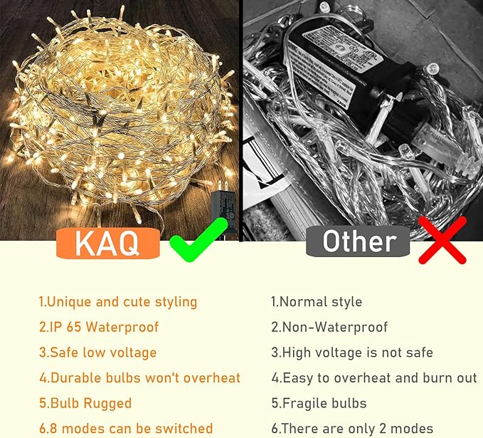 - [Long-Lasting Warmth & Ambiance] KAQ 300 LED Christmas string lights feature warm white LED beads (300pcs) with 98.4ft/30m ultra-long length, creating a cozy atmosphere for both indoor Christmas trees and outdoor decorations. The included 16.4ft extension cable ensures flexible placement for wrapping around balconies, patios, windows, or even connecting multiple strands. Perfect for christmas lights bedroom, fairy lights plug in setups, or enhancing christmas decorations year-round.