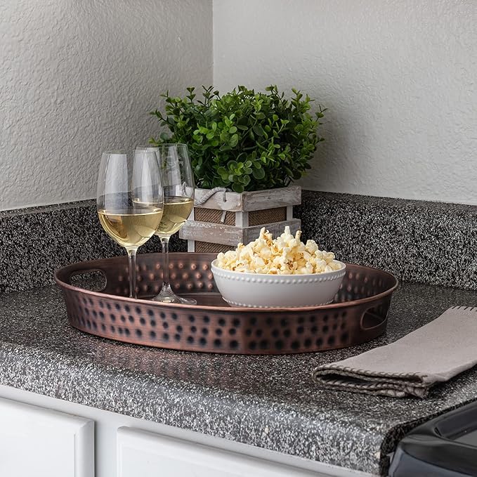 - IDEAL SIZE: Crafted at the perfect dimensions of 17" x 13" and a graceful oval shape in antique copper finish, this tray with handles offers ample space to carry plates, cups, wine glasses, and dessert platters, making it the perfect brunch display tray for food or picnic tray for food.