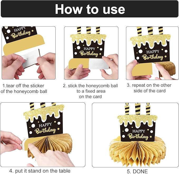 - How to use: Step1, tear off the sticker of the honeycomb ball. Step 2, stick the honeycomb ball to a fixed area on the card. Step 3, repeat on the other side of the card. Step 4,finally put it stand on the table. It's so easy that you can save a lot of time .