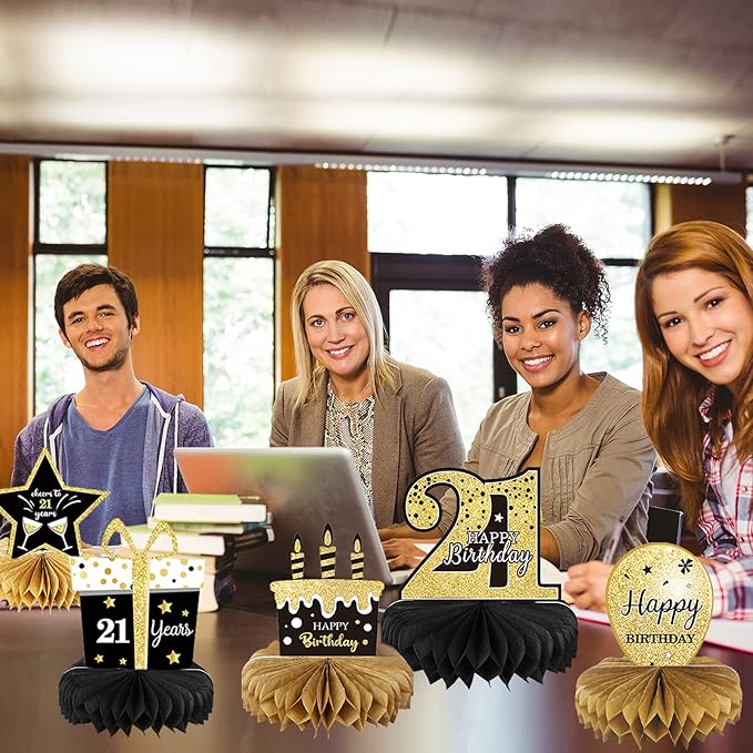 - Great 21st birthday party supplies: these cheers to 21 years table centerpieces exquisitely designed with interesting birthday elements so that everyone will love these chic designs. Decorating your home and party with our honeycomb centerpieces will be a big hit at your party.