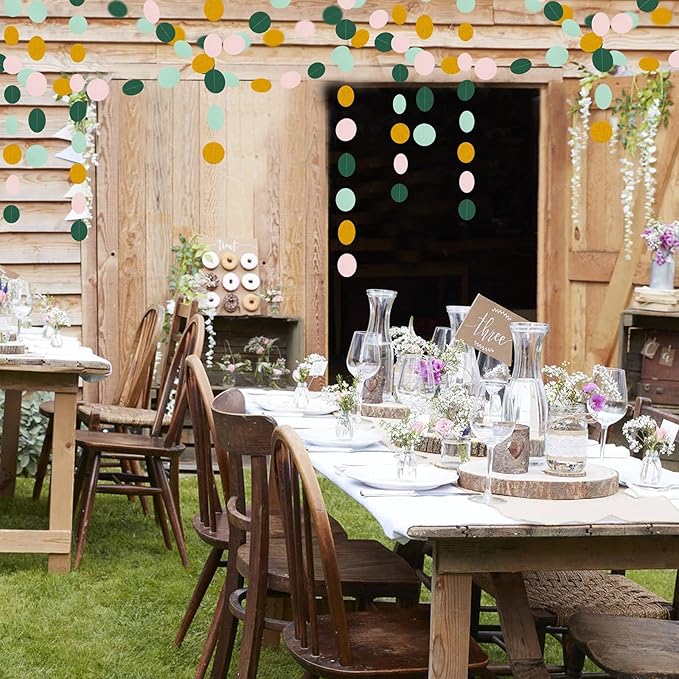 - 【 Easy to assemble 】Just open the package to hang it directly because they have been sewn together with double sturdy thread, which can really save your time and energy.The sage-green pink gold garland can be hanging from ceiling,above a table, under the verandah, or from branches in trees .