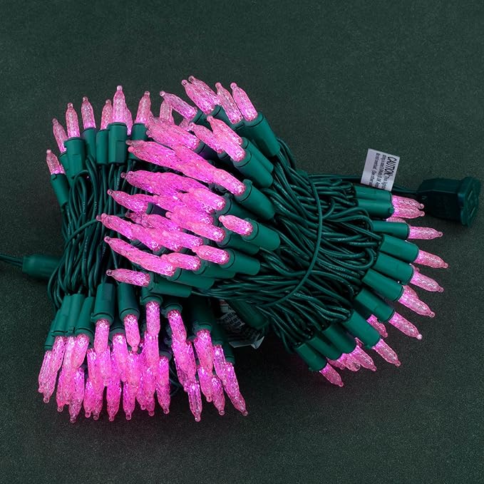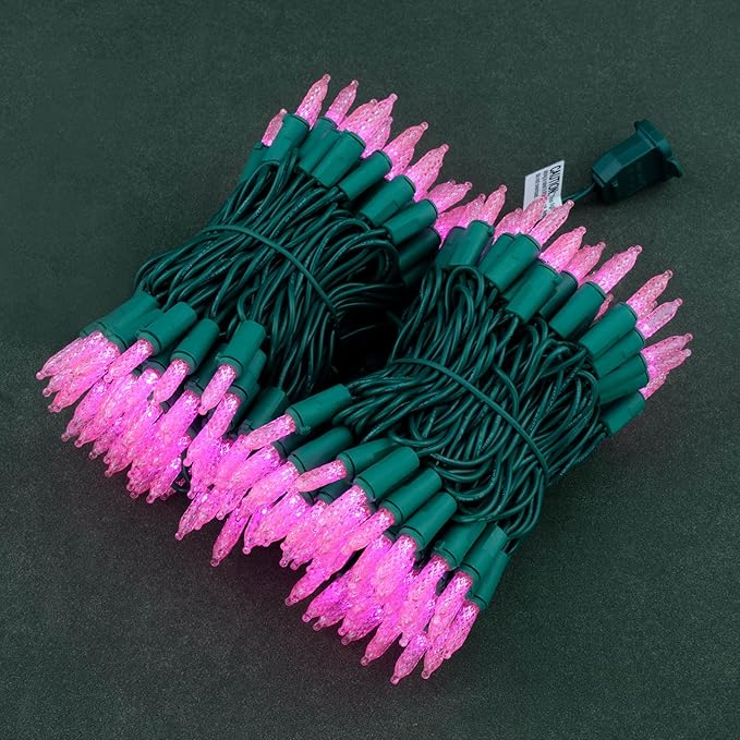 YULETIME Pink LED Faceted Christmas Lights 200 Count 50 ft, Pack of 2 Strands 25 ft 100 Lights UL Certified Commercial Grade Green Wire Mini Holiday String Light Set (Pink)