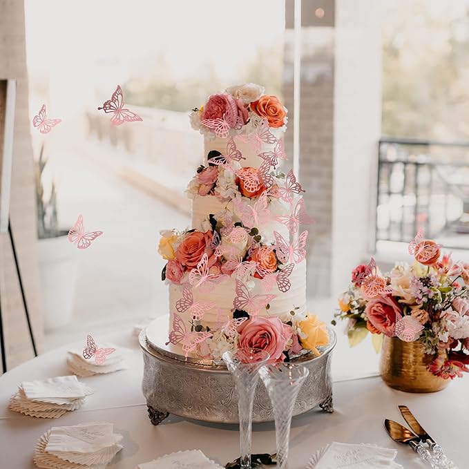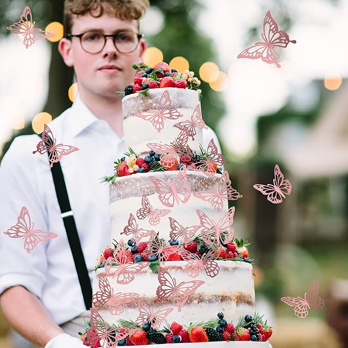 40 PCS Lively 3D Butterfly Cupcake Toppers - Laser Cut Hollow Butterfly Cake Decorations for Baby Shower, Wedding, Anniversary & Birthday Parties - Mixed Styles, Rose Gold