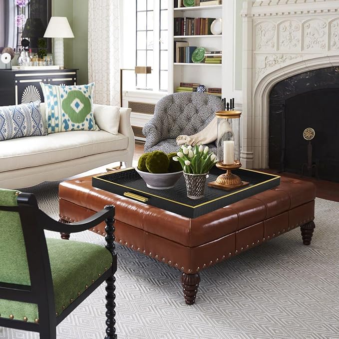 - Oversized faux leather serving tray for serving your favorite foods and beverages atop your ottoman or coffee table; Boasts an ample serving area with high sides and cutout handles; Ribbed base is an attractive accent that inhibits items from sliding around.