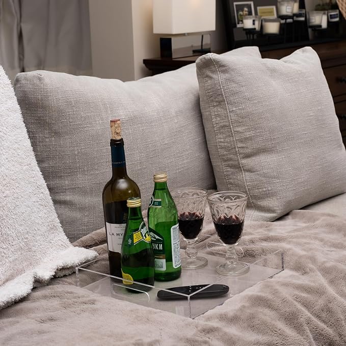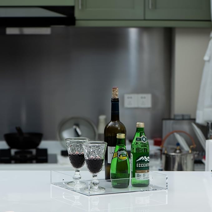 Clear Sturdy Acrylic Serving Tray with Handles 12x12x2H Inches -Spill Proof- Decorative Trays Countertop Organizer for Ottoman Coffee Table Nightstand, sidetable, Breakfast, Tea, Food