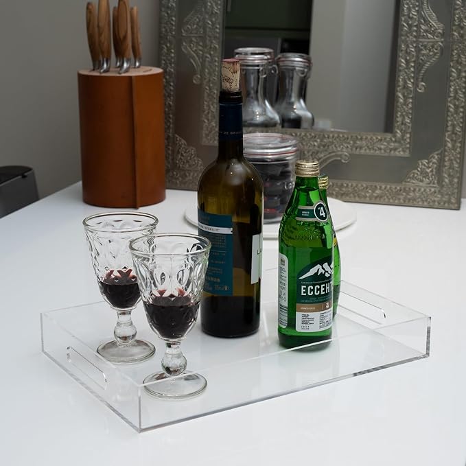 Clear Sturdy Acrylic Serving Tray with Handles 10x15x2H Inches -Spill Proof- Decorative Trays Countertop Organizer for Ottoman Coffee Table Nightstand, sidetable, Breakfast, Tea, Food