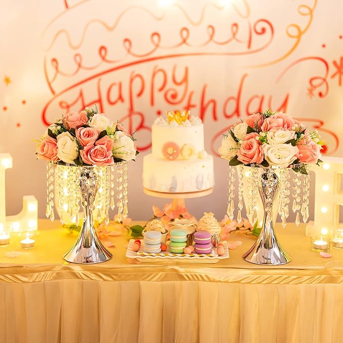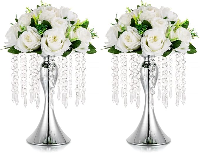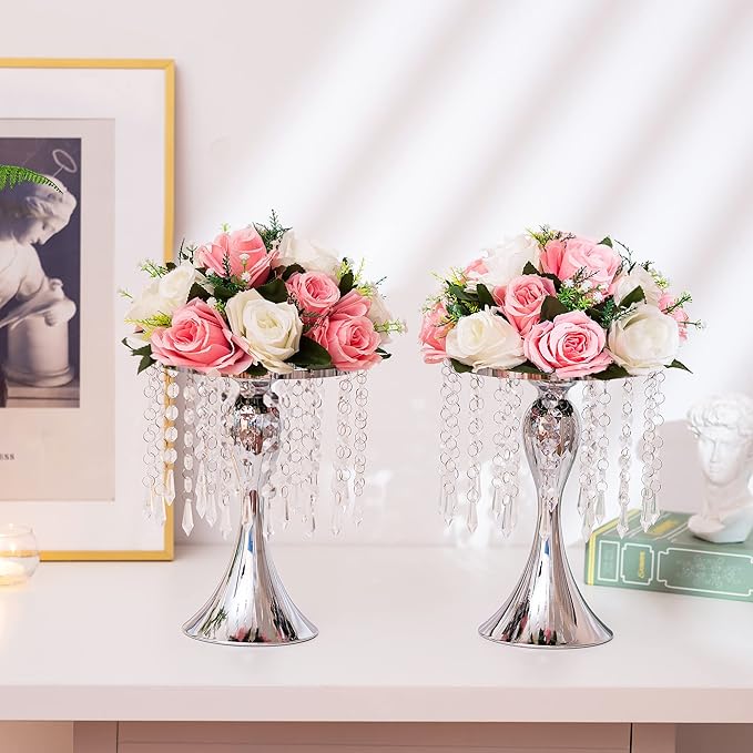 Silver Vases for Centerpieces, 10.2in Crystal Flower Arrangement Stand, Wedding Centerpieces for Tables, Tall Metal Flower Vase Holders for Wedding, Event, Reception, Birthday, Home Decor, 2 Pcs