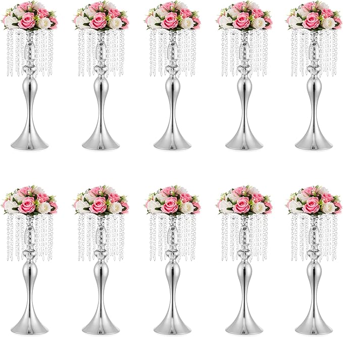 - Easy to Install&Packing List: No tools required. Inweder tall vases for centerpieces can be quickly installed in a couple of minutes. Besides, we provide a Detailed Instruction Manual and an Installation Video that can help you install the centerpiece table decorations without any difficulty. Packing List: 10 x Silver Vases (Height is 21.3", Base Diameter is 7", Top Diameter is 7.87"),1 x Instruction Manual.