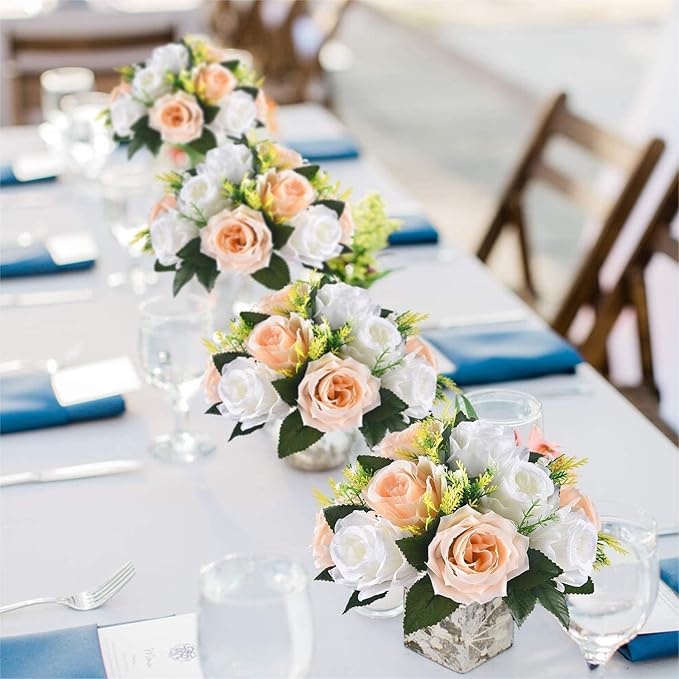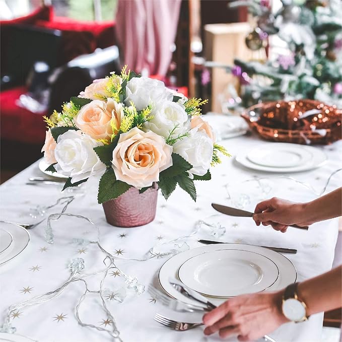 - VIVID & ELEGANT: Each faux flower bouquet with base has 15pcs, they measures 4.7" tall, diameter of one flower approx 10.3". The artificial roses are look beautiful and vivid. Imparting a elegant radiance to dull tables, backdrops, vases and centerpieces.