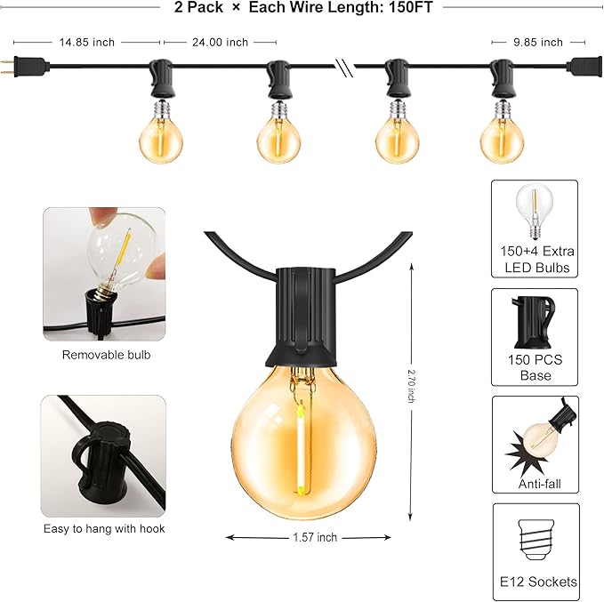 Outdoor String Lights 300FT Waterproof Globe String Lights with 150+4 Shatterproof G40 LED Bulbs,Dimmable Connectable Patio Lights String for Hanging Bistro Backyard Gazebo,2-Pack x 150 FT
