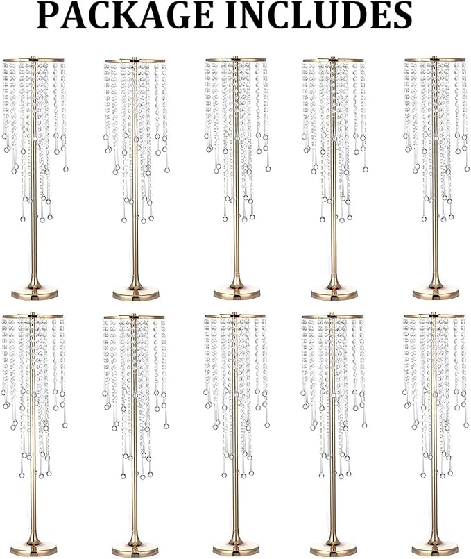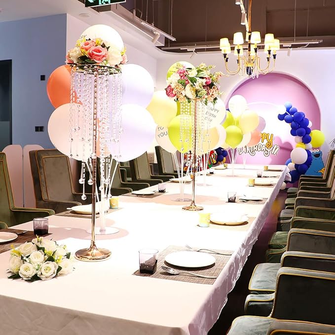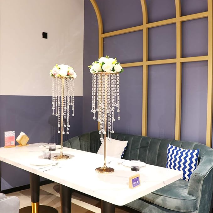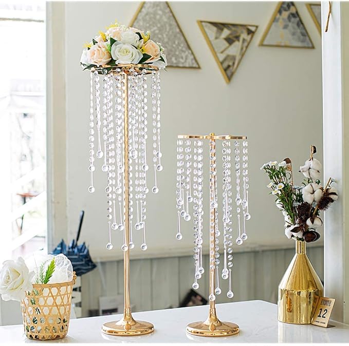 - ELEGANT DESIGN: This charming and sparkling flower stand is especially suitable for wedding centerpieces and is made of high quality metal. Add sparkling sparkle to any festive occasion by placing sparkling drip-style acrylic crystals on an elegant stand. Beautifully styled with modern design, you can decorate it with hanging flower vines or place flower balls on top, it will definitely make your wedding, party or home more gorgeous and attractive even without any matching.