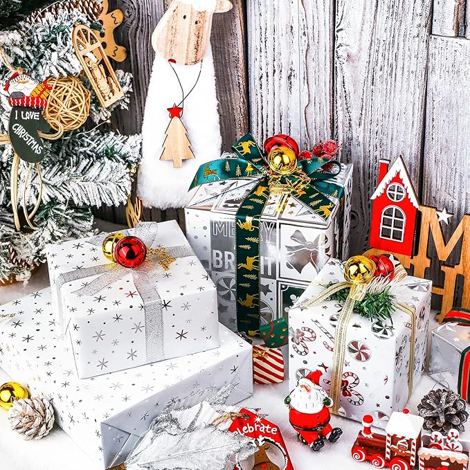 - Package: The package includes 4 rolls wrapping paper (30"x120") with gridlines on the reverse; 9 are 3" gift bows(metallic silver), 18 are 2.36"x2.36" gift tags (3 designs, 6 each of design), 5 sheets gift stickers, 3 ribbons (3 Colors, 10M/Color), the coordinated set can meet your gift wrapping needs.