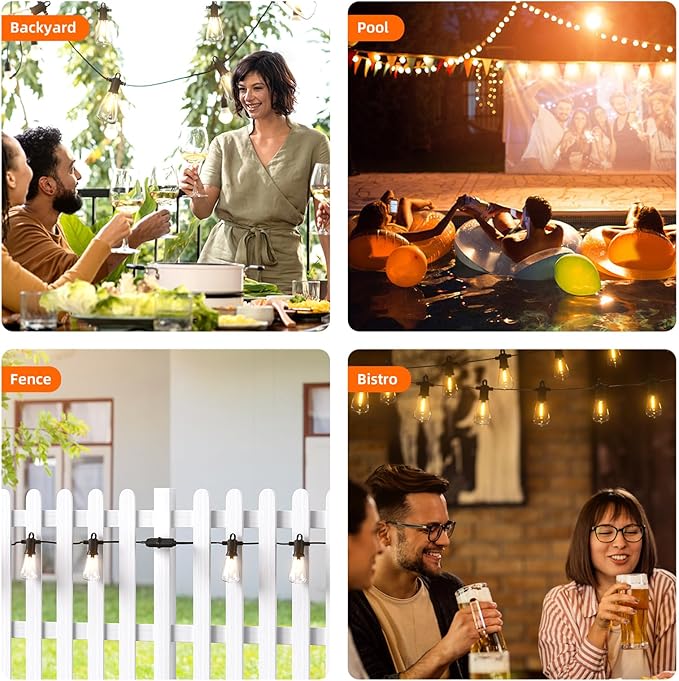 - Personalized Backyard: This 25ft cafe lights outdoor string lights can be connected to external light strings with 35 strings through end-to-end connectors. It is suitable for large-area outdoor lighting. Design your own light show according to your preferences.