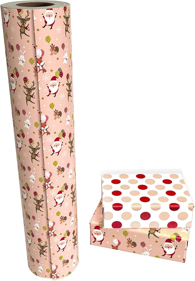 WRAPAHOLIC 30 Inch Jumbo Reversible Christmas Wrapping Paper - 30 Inch x 100 Feet Jumbo Roll Red and Pink Dancing Santa Claus Reindeer and Colorful Polka Dots Design for Christmas, Holiday, Party