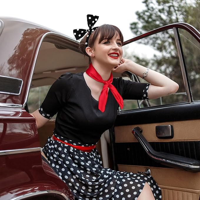 - Scarf: made of chiffon, this scarf of our 50s costume accessories set offers a vintage look and feel, making it suitable as a 50s neck scarf or for retro events