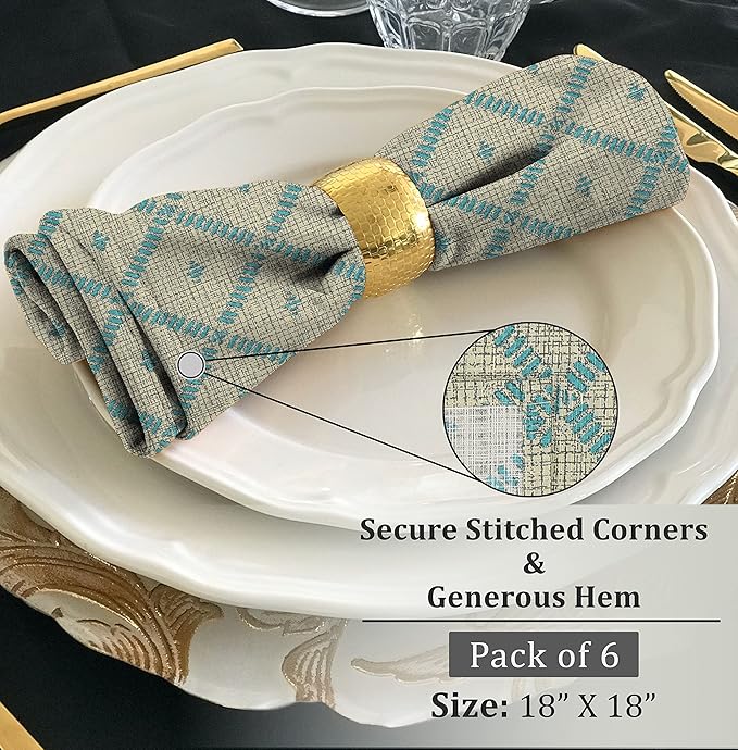- Economy Pack: Our napkins cloth are Carefully cut and sewn with perfect Secure Stitched Corners and a generous hem. Our table Napkins came in a Value Pack of 6 Pieces measuring 18 by 18 inches each.