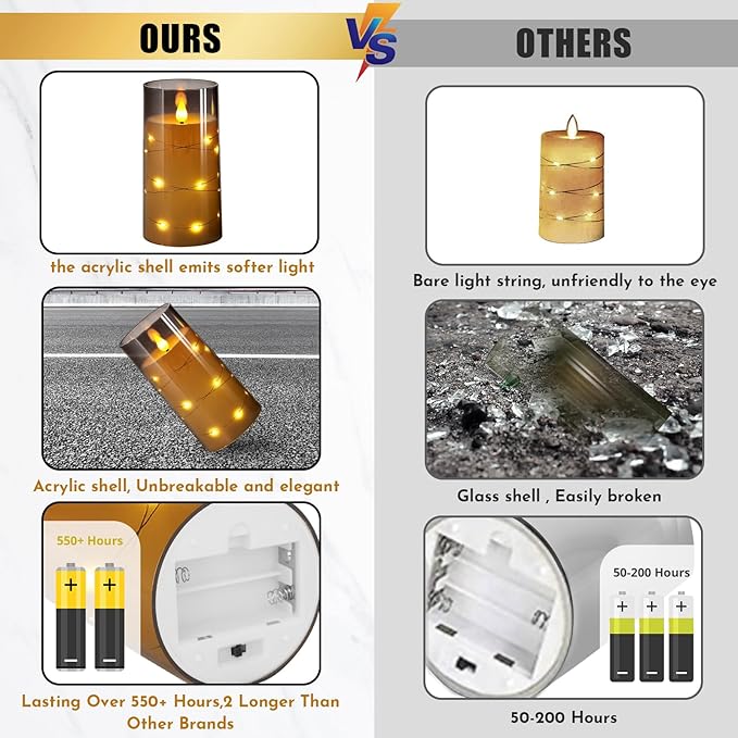 - 【Unbreakable Material, Realistic Appearance】flameless candles are made of high quality acrylic. Compared with glass radiance candles, acrylic shells make the battery candles stronger and lighter. Through the clear shell, you can see the real flame effect