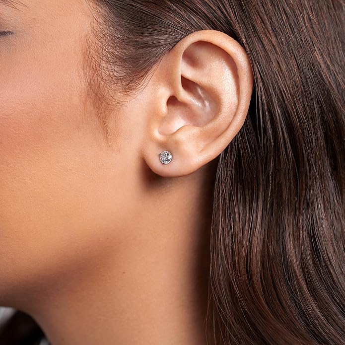 - ELEGANT AND CLASSIC - All components of these stud earrings were crafted in real, solid, 14k White Gold (rhodium-plated, nickel-safe, and tarnish-free). These earrings feature two sparkling round diamonds with F-G Color and SI2-I1 Clarity totaling 1 carat (5 mm in diameter) set with 3-prong mounting. A built-in Screw Back mechanism is super convenient and will never get lost. The simplicity of the stud setting highlights the intrinsic beauty of the diamonds and draws attention to the face