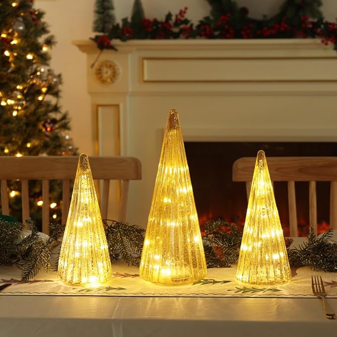 YEAHOME Christmas Decorations Indoor, 3 Pack Pre-lit Gold Glass Christmas Tree Home Decor, Christmas Table Decorations Lighted Xmas Tree with Timer for Living Room Fireplace Tabletop Party