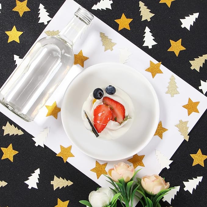 - The party confetti includes 300pcs paper dots. The size of the tree confetti is 1.57”,star is 1.2" which is more thick and bigger than plastic confetti. So it’s much easier to clean up.