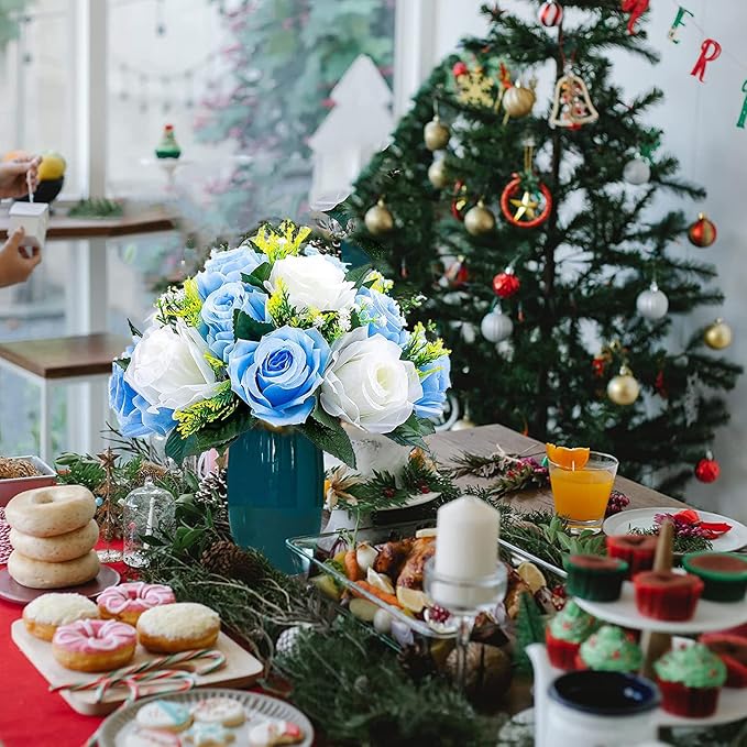 Artificial Flowers Rose Centerpieces, 6 Pcs Faux Flower Kissing Ball Fake Flower 15 Heads Plastic Roses with Base Perfect for Wedding Bouquets Party Table Decor for Flower Balls Wedding(Blue White)