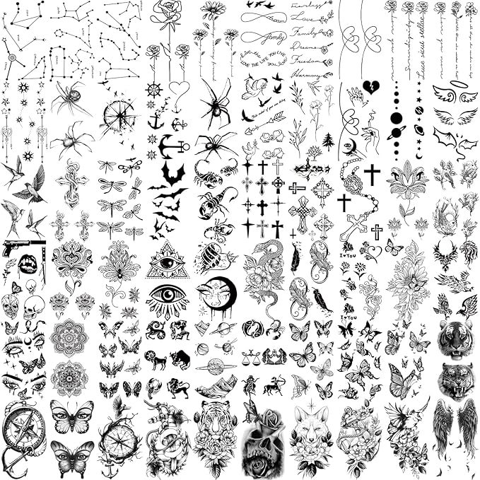 - UNIQUE DESIGN -- Contain more than 500 exquisite designs include flowers, butterflies, skulls, lions, wolves, foxes, eagles, hearts, arrows, feathers, small animals and more. Can be attached to various parts of the body, such as arms, shoulders, back, thighs, waist, etc