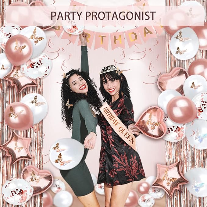 - [236 PCS MEGA BIRTHDAY DECORATION KIT] - A value-for-money package that includes everything you need to throw an enviable birthday party! 12 butterfly decorations, 2 rain curtains,6 hanging swirls, 1 “HAPPY BIRTHDAY” banner, 4 foil balloons with hearts and pentagrams, 30 latex balloons in different colors, 2Ribbon, 1 balloon chain, will decorate a perfect rose gold birthday party for you!