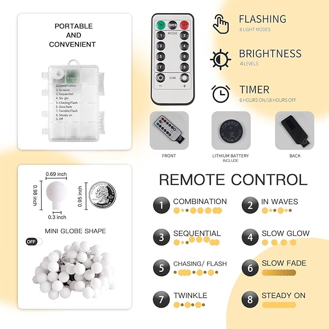- CONVENIENCE TO USE: These battery operated globe string lights are very convenient for indoor or outdoor use. Besides, it comes with a remote control, which makes it easier to change lighting modes and turn on and off the light without any hassles.