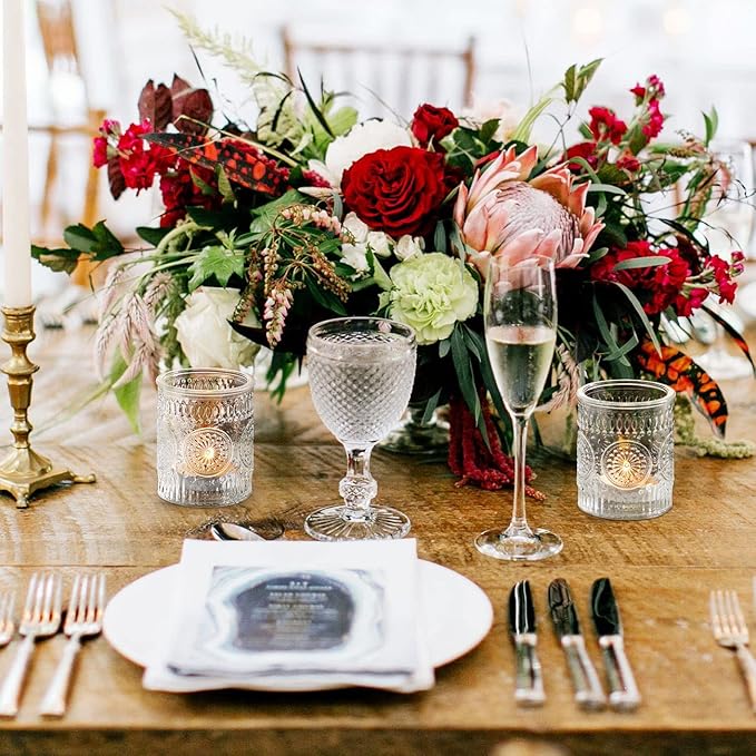 - High Quality and 24 Pcs Vintage Candle Hholders: These charming cute candle holders are made of thick & strong glass, which are durable and not easy to break. Each order will consist of 24pcs glass votive holders .(Candles Excluded),