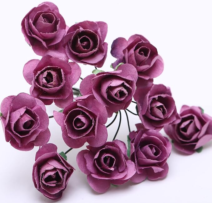 144pcs Mulberry Paper Mini Roses Artificial Flowers Heads with Stems for DIY Crafts Accessories Make Bridal Hair Clips Headbands Dress Wedding Bridal Bouquets Party Home Decor Valentine's (Purple Red)