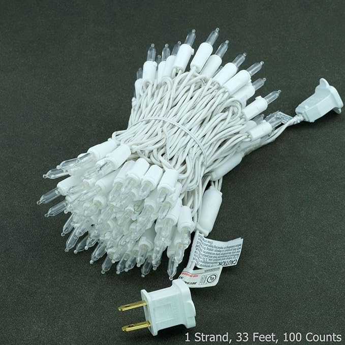 - Specifications: 33' total length of white wire with 100 warm white LED bulbs, 4" spacing, 5" lead, 5" tail. Commercial grade 22 AWG wire with pure copper core. Strings can be connected end-to-end for expansion. 4.8 watts per strand, rated for 216 watts maximum wattage and up to 45 strands can be used simultaneously. Indoor and outdoor use. For longer and more lights, please search for ASIN B09BCWM1DC.