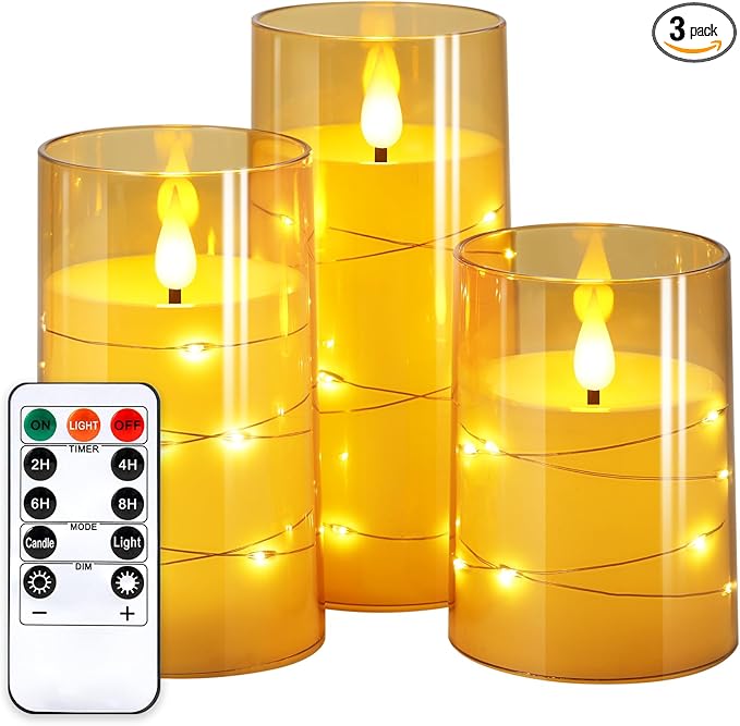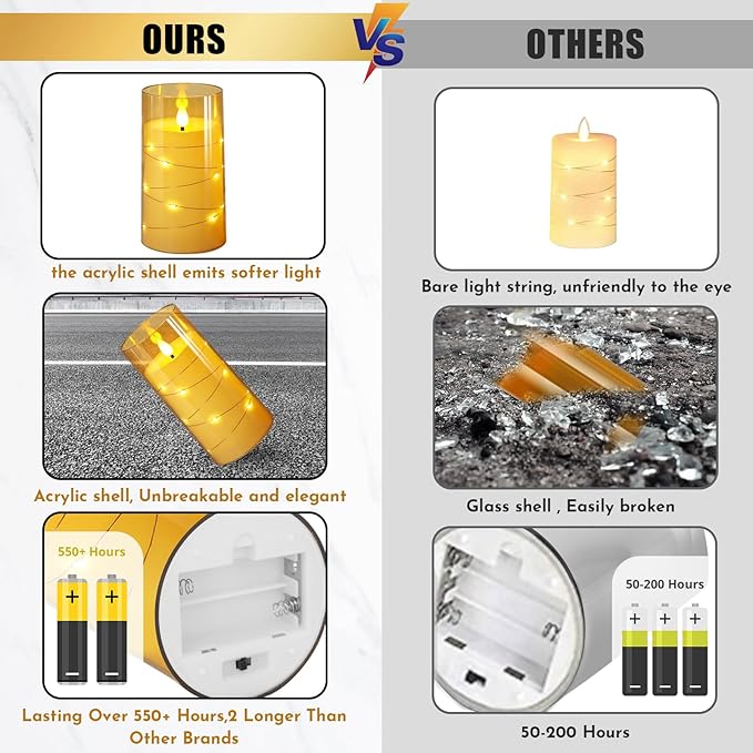 - Creative Embedded Starlight String Technology - Silver metal wire strung 16 warm little stars, winding around the middle flameless candle, this unique designed acrylic shell makes the LED pillar candle light shine softer and not dazzling. While the candle bright, the string of 12 to 16 LEDs are also lit. Placed on your bedside or dinner table, the extreme warm and romantic candlelight and starlight are full of classical and noble atmosphere, real and beauty