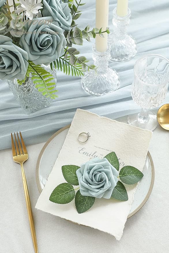 Floroom Artificial Flowers 25pcs Real Looking Dusty Blue Foam Fake Roses with Stems for DIY Wedding Bouquets Bridal Shower Centerpieces Floral Arrangements Party Tables Home Decorations