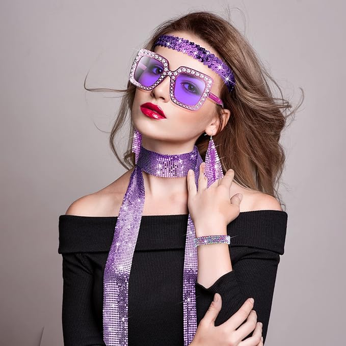 Sasylvia 5 Pcs 70s Disco Accessories Halloween Women Costume Jewelry Sequin Scarf Earrings Sunglasses Bracelet Headband
